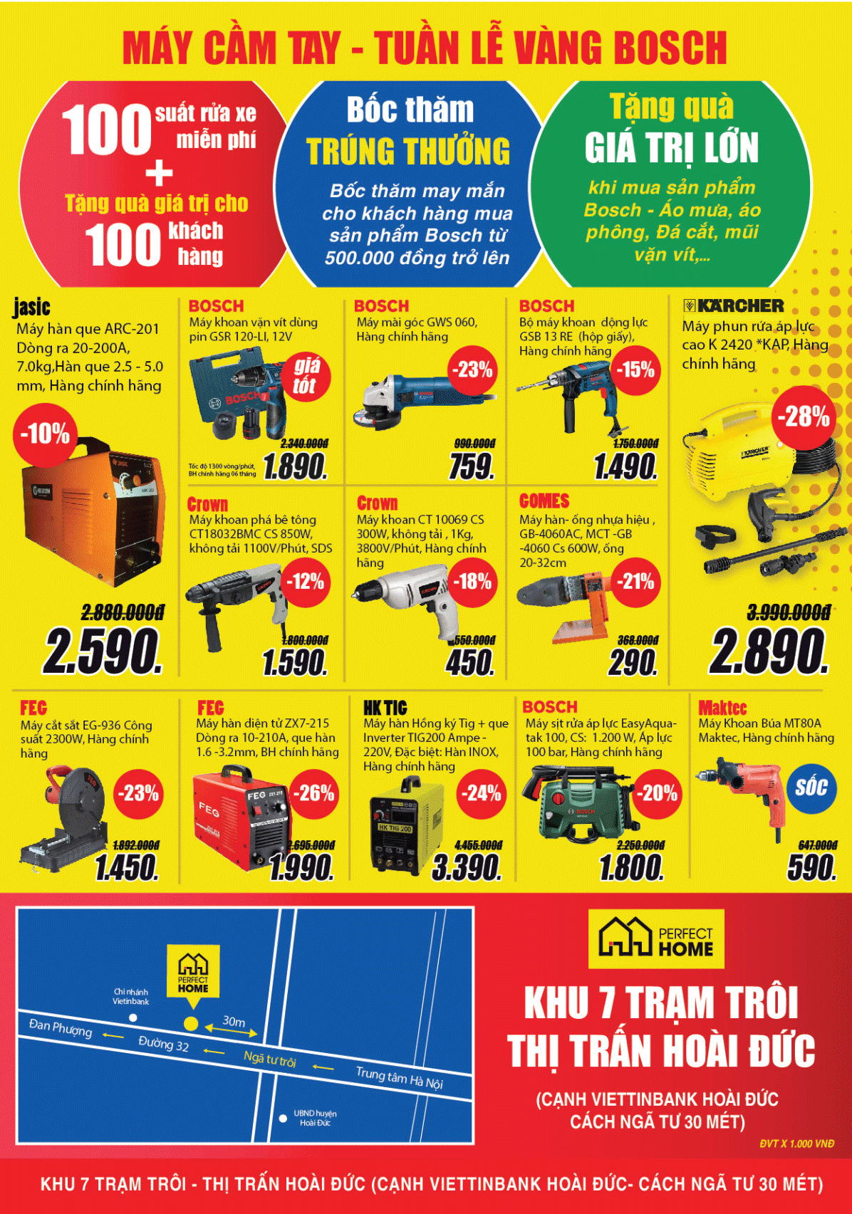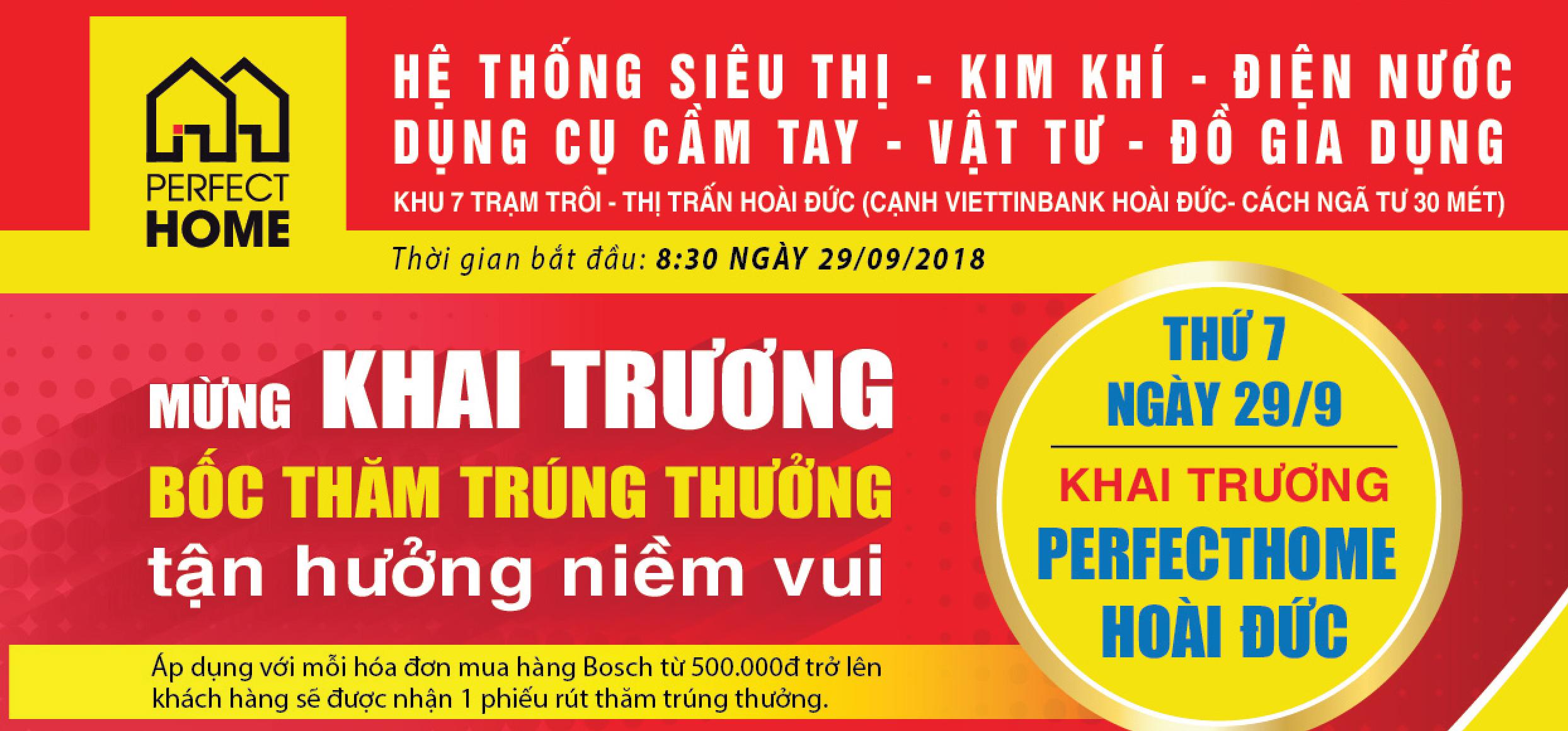 Nhân dịp khai trương siêu thị #PERFECTHOME Hoài Đức ngày 29/9/2018. Với mỗi hóa đơn mua hàng BOSCH tại siêu thị từ 500.000đ trở lên khách hàng sẽ được nhận 1 phiếu bốc thăm trúng thưởng