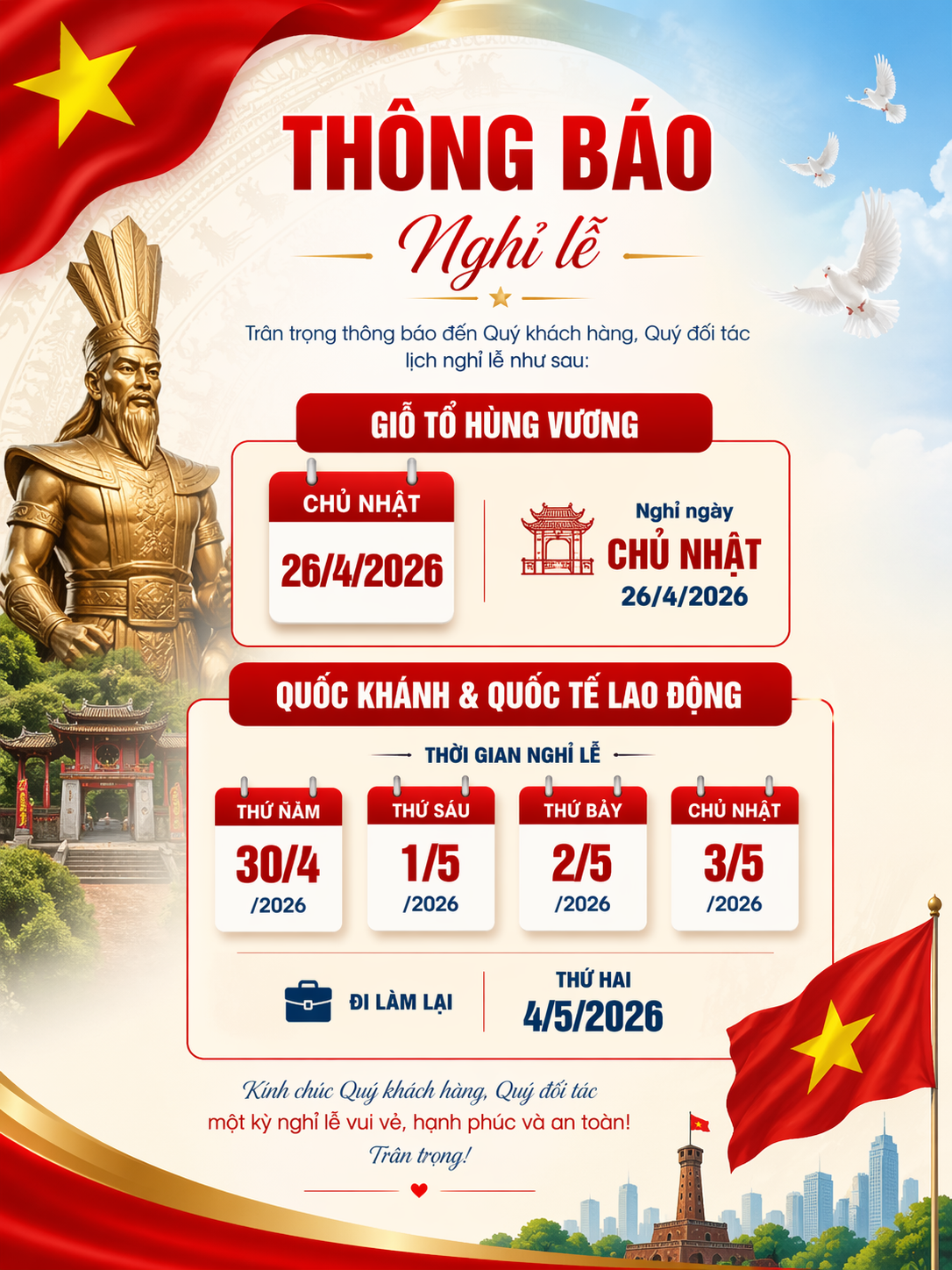 Công ty xin trân trọng thông báo đến Quý khách hàng và Quý đối tác lịch nghỉ lễ Giỗ Tổ Hùng Vương, Ngày Giải phóng miền Nam 30/4 và Ngày Quốc tế Lao động 1/5 như sau:
