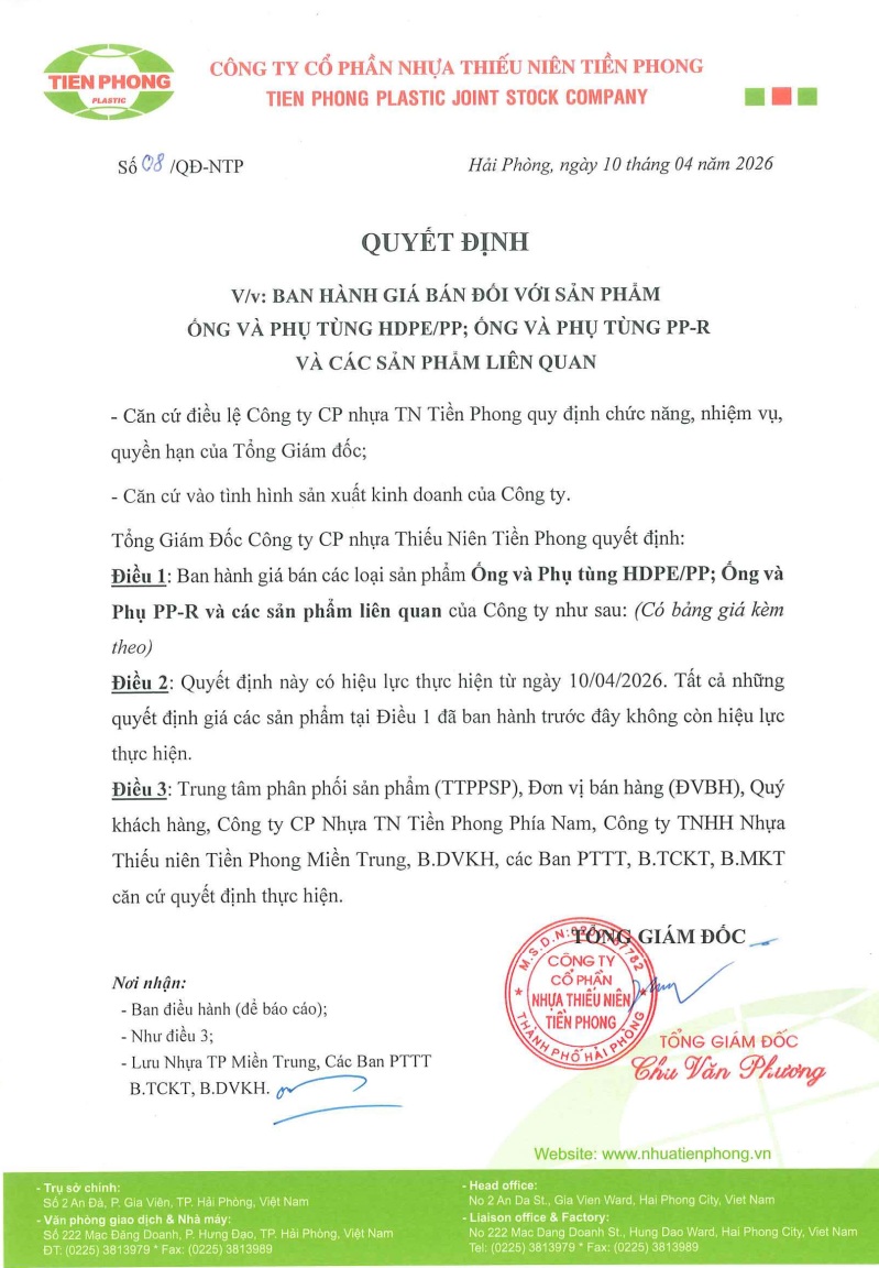 THÔNG BÁO BẢNG GIÁ MỚI ỐNG NHỰA PPR, HDPE CỦA TIỀN PHONG áp dụng 10.4.2026